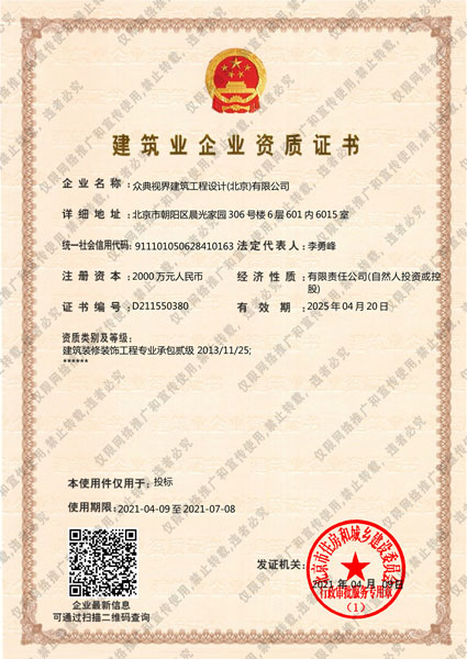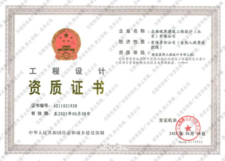 •眾典視界建筑工程設(shè)計(北京)有限公司創(chuàng)立于2012年,系北京市工商局注冊、國家建設(shè)部核定的建筑裝修裝飾工程專業(yè)承包二級資質(zhì),建筑裝飾專項工程設(shè)計乙級與建筑、消防設(shè)計甲級的工裝類工程公司。