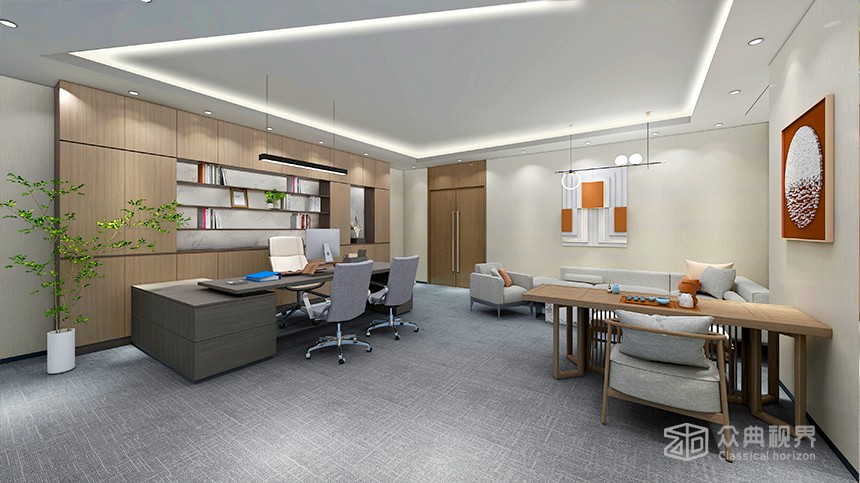 前廳設(shè)計(jì)上簡約靈動的設(shè)計(jì)宗旨,背景墻采用烤漆木線條。兩種顏色混拼,波浪狀圖形,也是引申自公司LOGO,“眾”字的“人”字,進(jìn)行變形設(shè)計(jì),呈現(xiàn)出動感活力的設(shè)計(jì)效果,視覺沖擊感比較強(qiáng)。LOGO墻和電梯兩側(cè)天花邊緣均采用燈帶或者洗墻燈的效果,讓空間的燈光增加更多的層次感。