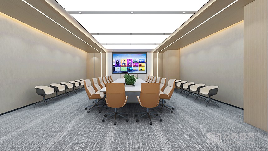 大會議頂面采用軟膜天花矩陣排列,墻面為素色壁布。兩側(cè)對開門和大柱子,均采用木飾面裝飾,對開門做成隱形門,這樣既弱化了對開門和大柱子,造成的空間壓抑感,同時美化了空間,將左右兩側(cè)形成視覺上的對稱感。大會議室給人以沉穩(wěn)大氣的空間感受。