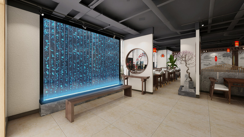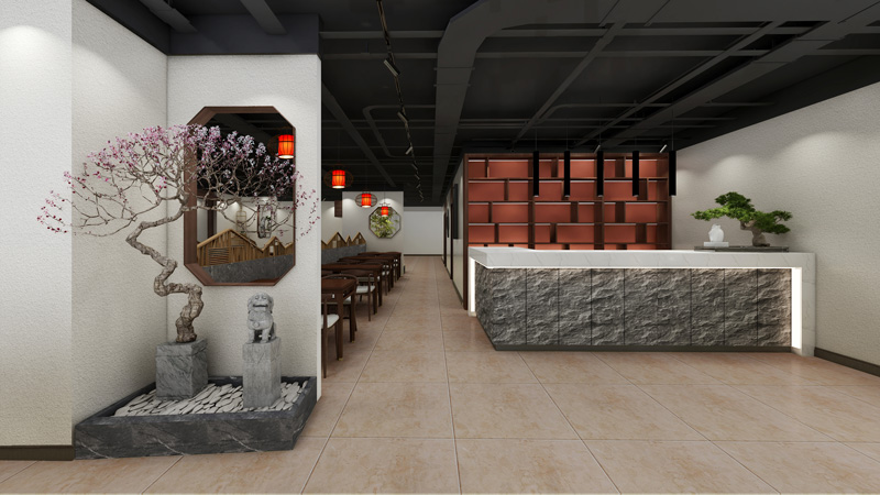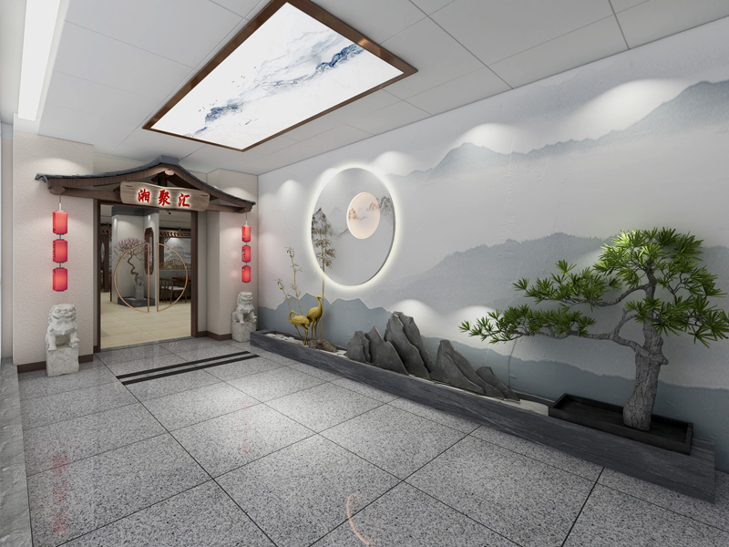 湘聚匯餐飲主營湘菜,為了突出地域特色,營造別具風(fēng)味的就餐環(huán)境,設(shè)計風(fēng)格采用新中式的設(shè)計。門頭采用中式飛檐的木質(zhì)結(jié)構(gòu),突出了湘西土樓的風(fēng)格。入戶區(qū)采用頂面采用水墨畫軟膜天花,墻面定制水墨壁畫,結(jié)合切片山石,以及迎客松的景觀設(shè)計,給人一種來到煙雨氤氳的江南的氛圍。