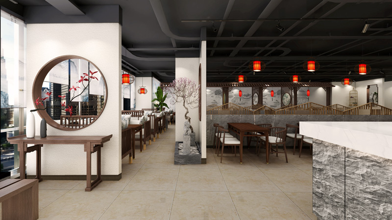 就餐大廳,由于原始柱子比較大,結(jié)合現(xiàn)場將柱子設(shè)計成景觀墻,不同造型的花窗,點綴竹子、桃花、芭蕉、松樹等景觀,虛實結(jié)合,移步換景,營造出詩情畫意的江南韻味。