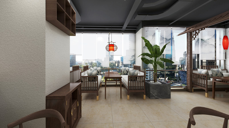 家具色調(diào)采用深色的胡桃木,搭配肌理感的白墻,紅燈籠燈燈飾,仿佛置身于明清的江南。